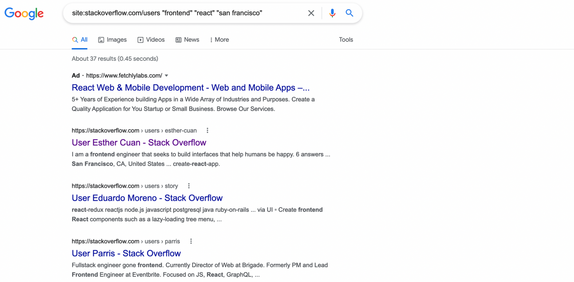 - Say, that I am also looking for a rock star backend developer for my company based out of SF. Now, I am looking for someone proficient in Python and is living in San Francisco. To avoid empty profiles and improve quality, I want profiles with reputation points between 500 and 1000. You can use the Numrange (..) function and type the following in Google’s search bar: