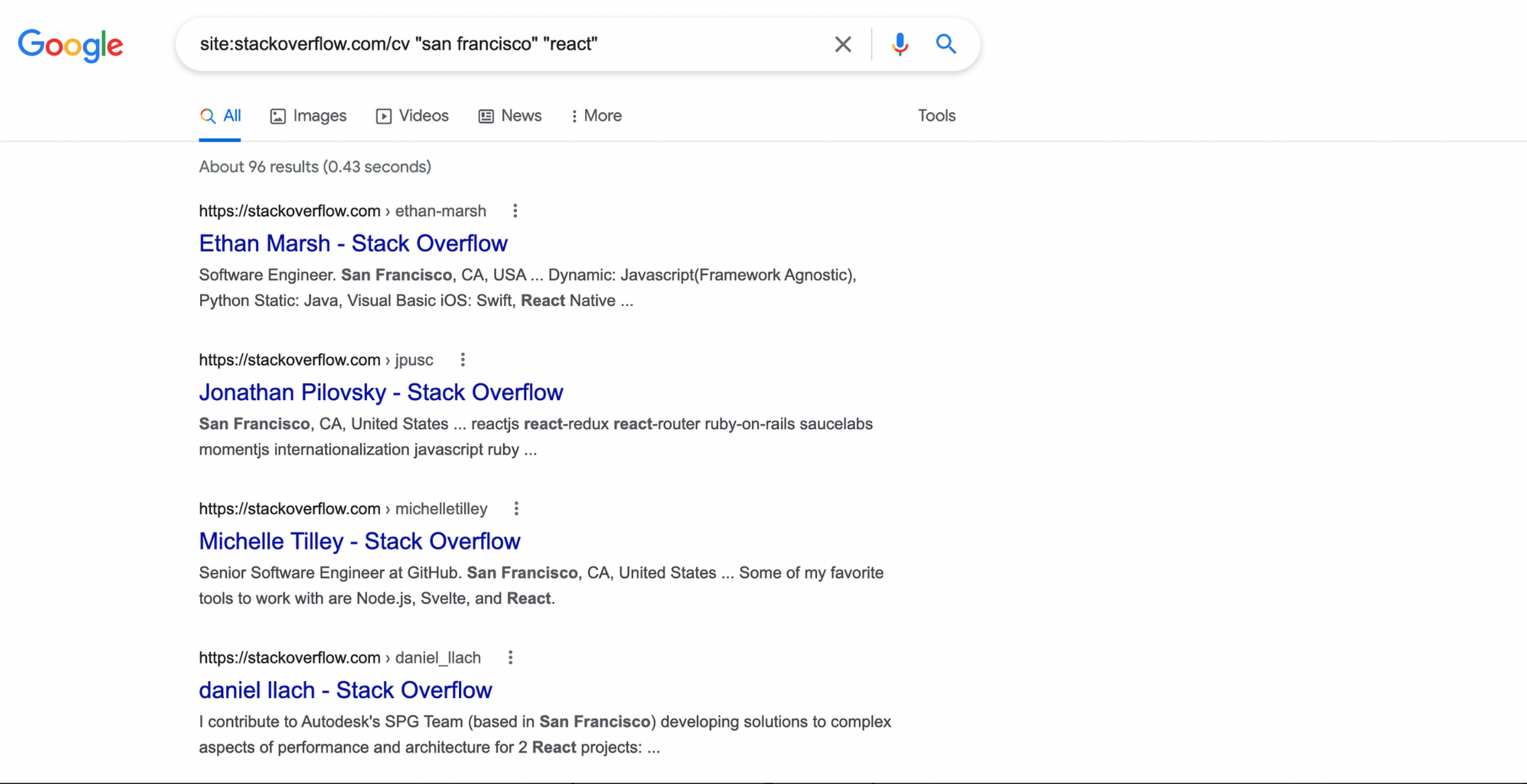 site:stackoverflow.com/users python San Francisco reputation 500..1000 - Or say you’d like to target the top Python coders in Stack Overflow. Then your numrange string could look something like this: