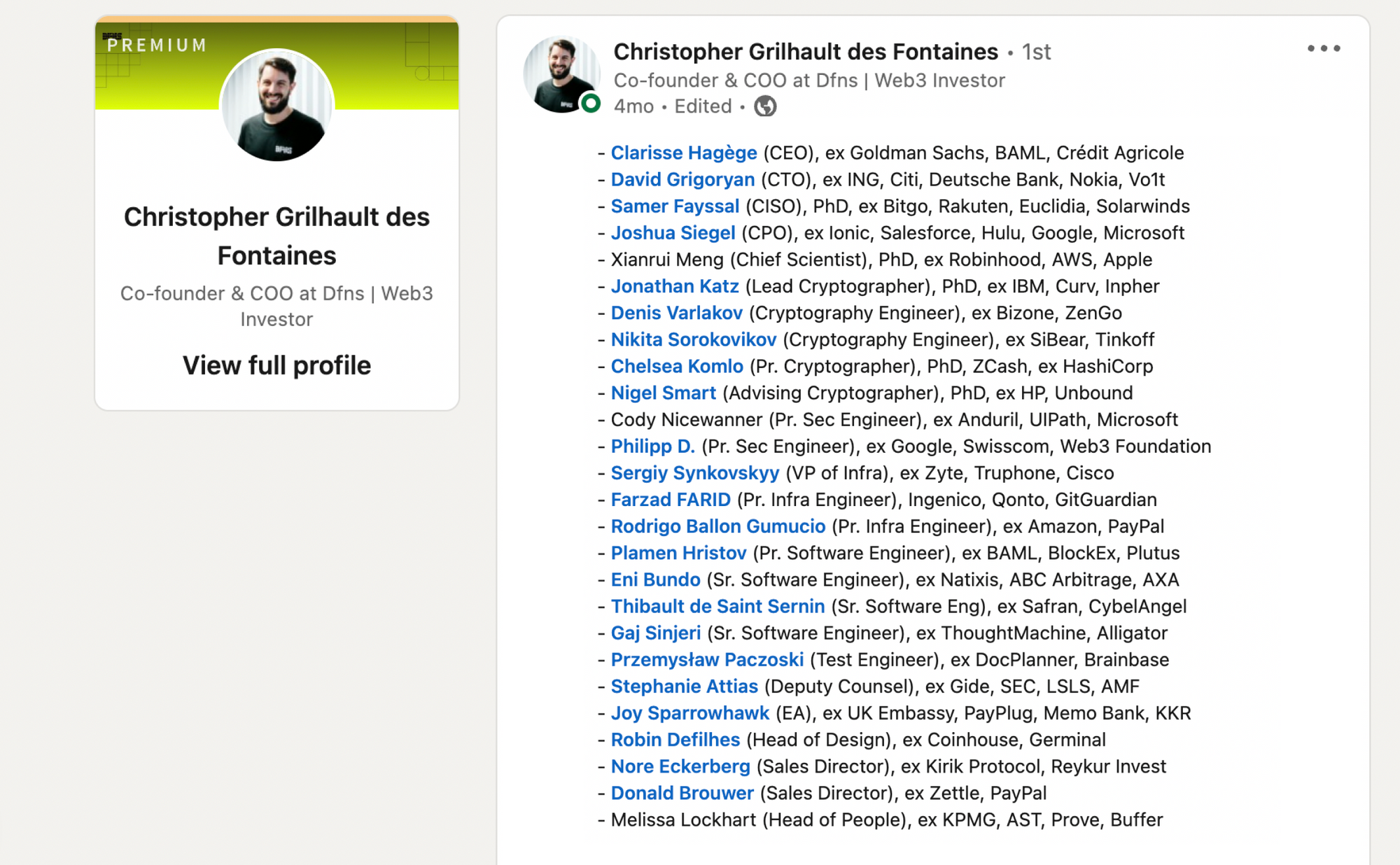 Like any other web3 company, DFNS is facing these challenges, still, it has managed to assemble a mouth-watering combination of top talent to build the keyless wallet infrastructure for Web3.0, as emphasized by it’s Co-founder & COO, Christopher Grilhault des Fontaines, in his recent LinkedIn’s post.