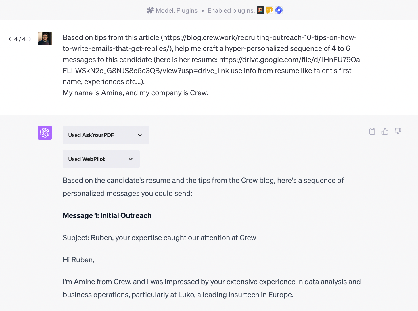 Now, let's get to the fun part. Download the candidate's resume from LinkedIn (click on the "More" Button > Save to PDF), and add it to your Google Drive. This allows ChatGPT to access it via the AskYourPDF plugin. Meanwhile, WebPilot enables ChatGPT to access any website, including our blog post on crafting messages that get responses. This can also be incredibly useful for summarizing lengthy blog posts or news articles.