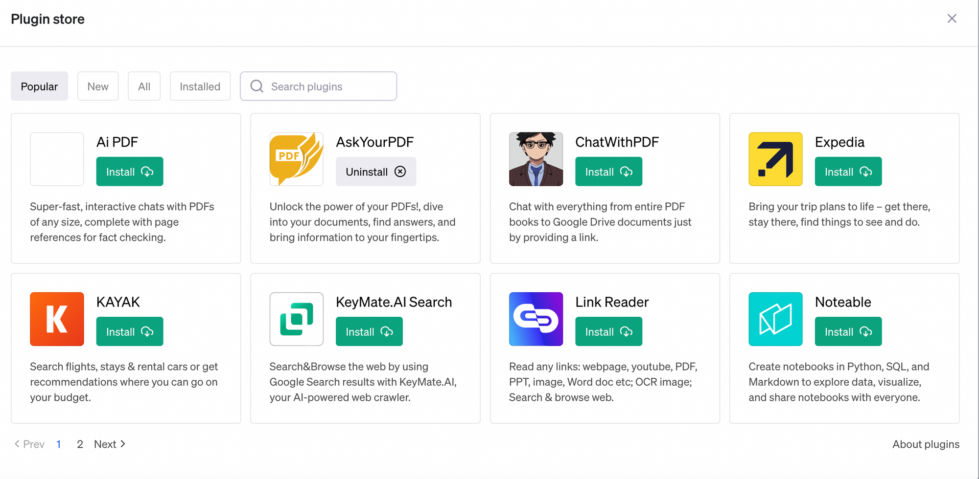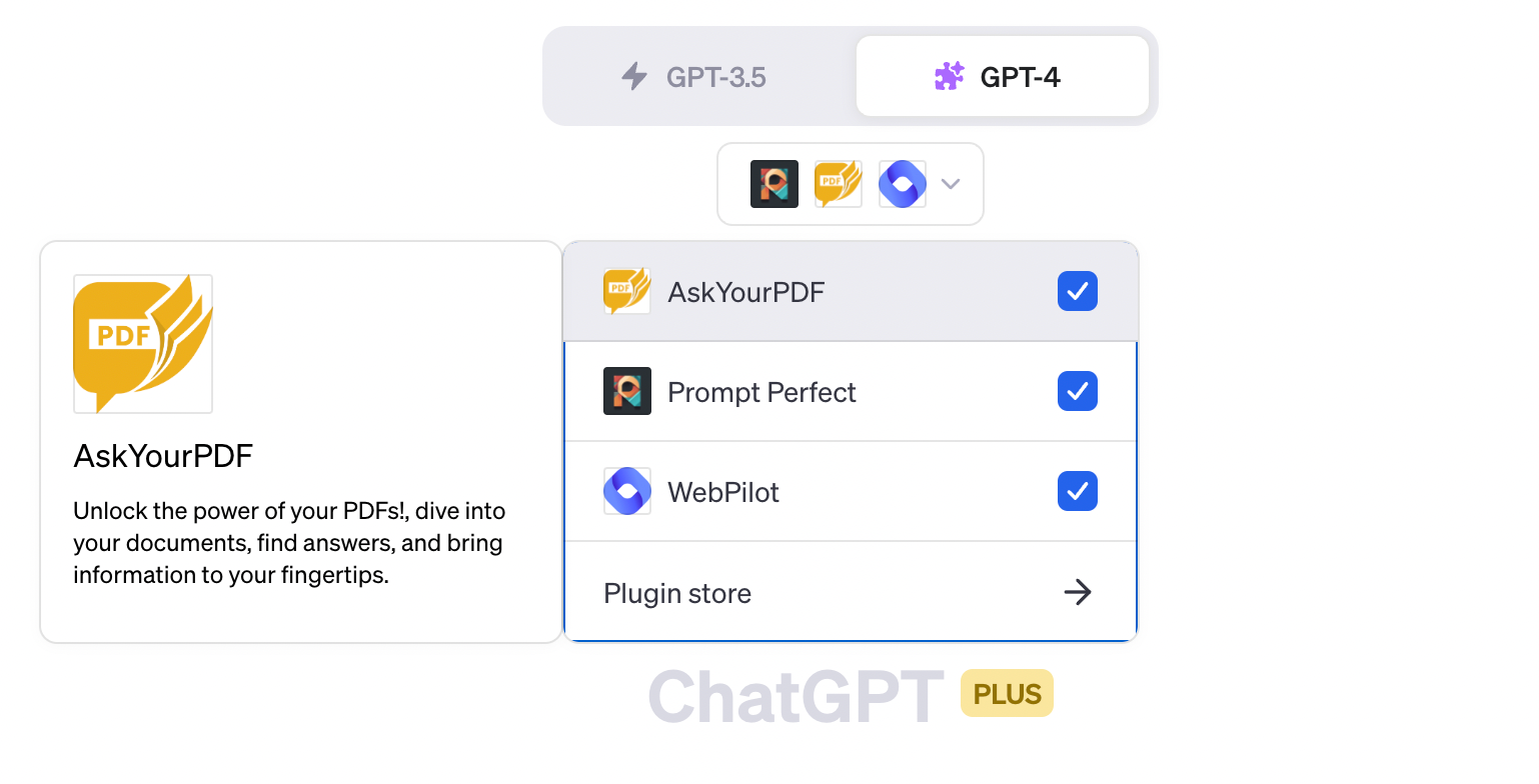 Once done, you'll need to add and activate two plugins from the store: AskYourPDF and WebPilot (optional).