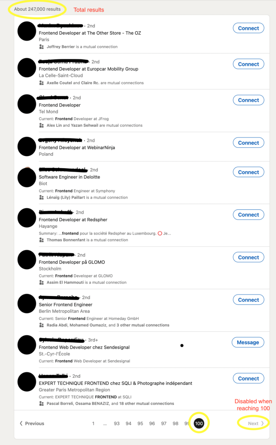 - Les résultats sont limités à 1000 profils (100 pages de 10 résultats). Alors qu'il peut y avoir 5000 personnes correspondant aux résultats. Vous en manquerez 4 000.